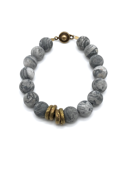 Recycled Glass & Brass Bead Stretch Bracelet- Blue Green