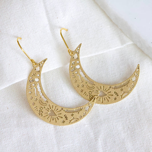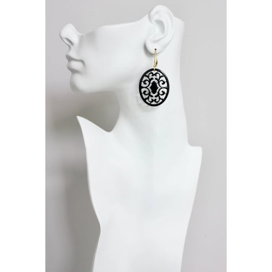 Brass & Wood Dangle Chandelier Earring- White Glass Bead